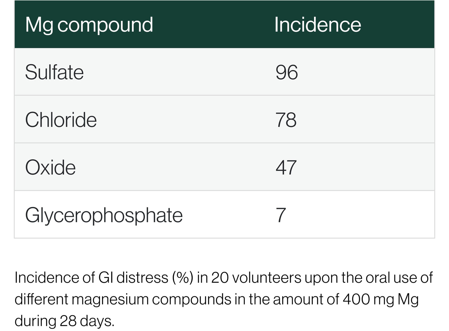 GIVOMAG™ Magnesium Glycerophosphate is clinically proven to have the lowest incidence of GI distress in comparison to some other forms of magnesium.